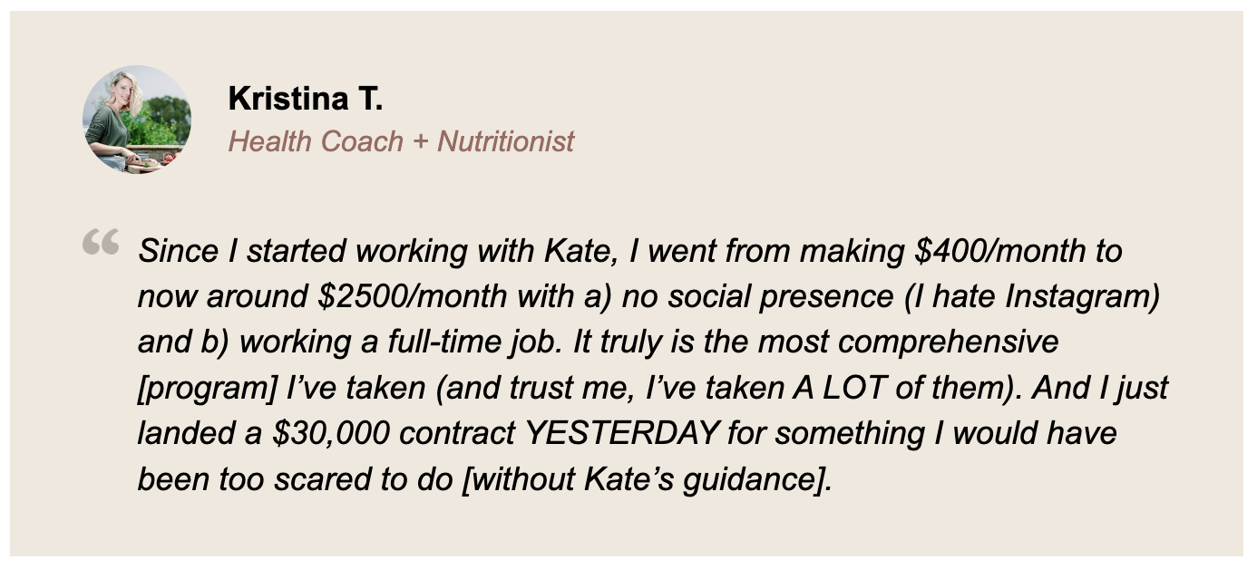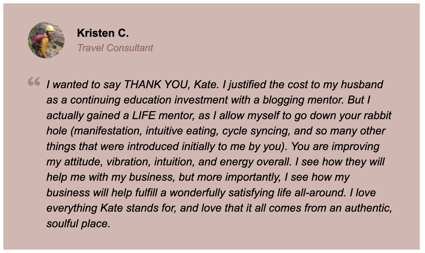 Kate has been so open and honest about the mindset and mechanics of making daily sales with a life-first business, without social media—and how this system works. The first day I focused more on email instead of social media, I made consistent sales for three days straight. If you’re an introvert who wants to lead a business in a way that suits you, it’s possible. And if you want a mentor who won’t sugarcoat ish, you need Kate. It redefined what it means to “show up” for my business—I don’t have to make a show of it on social; I can show up to actually lead it. It’s real, and Kate doesn’t leave you hanging in a sea of students—she knows your name and answers questions promptly. No person left behind in her house!