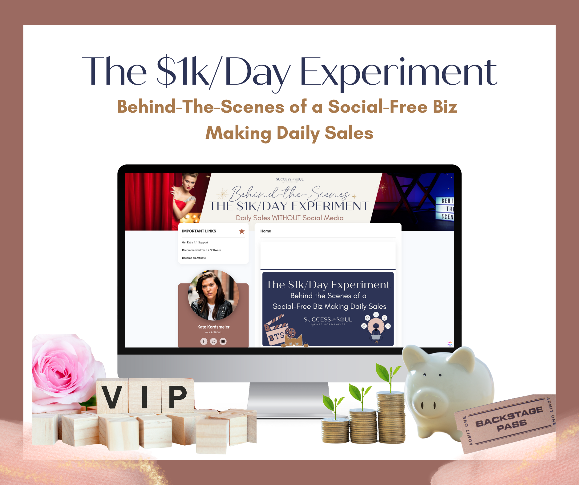Now, I’m aiming higher: $1k/day—and I want to take you behind the scenes as I figure it all out. Join me as I trial and error my way to this goal, where you'll get an unfiltered backstage pass into what's working, what's not and exactly what I'm doing every day to reach this milestone.
