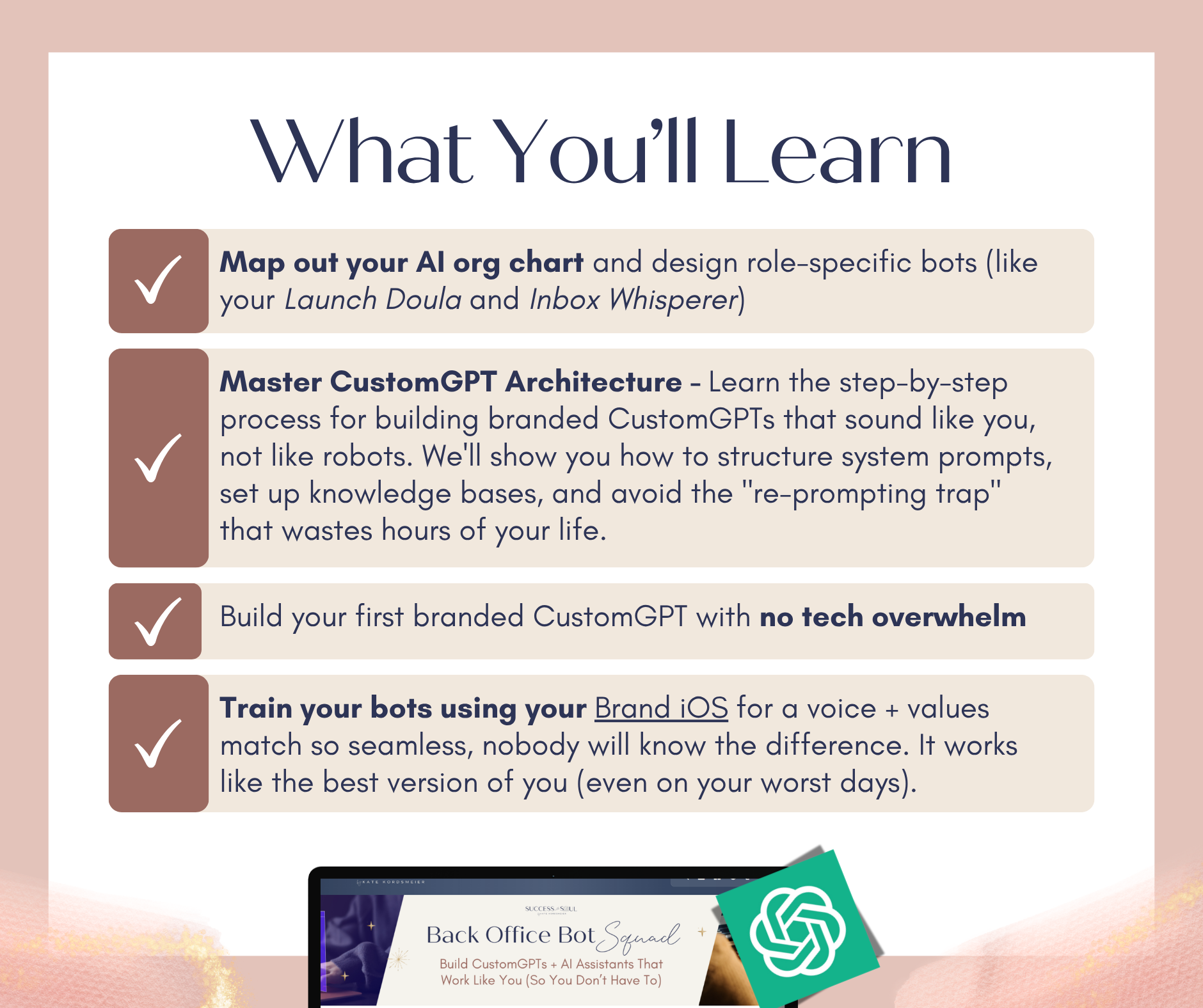 Back Office Bot Squad is your self-paced course to build your own AI dream team—CustomGPTs and AI assistants that get your voice, respect your boundaries, and run your workflows for you—so you can spend more time doing the work only you can do (i.e. showing up fully present for your clients, your family, and your own creative work).