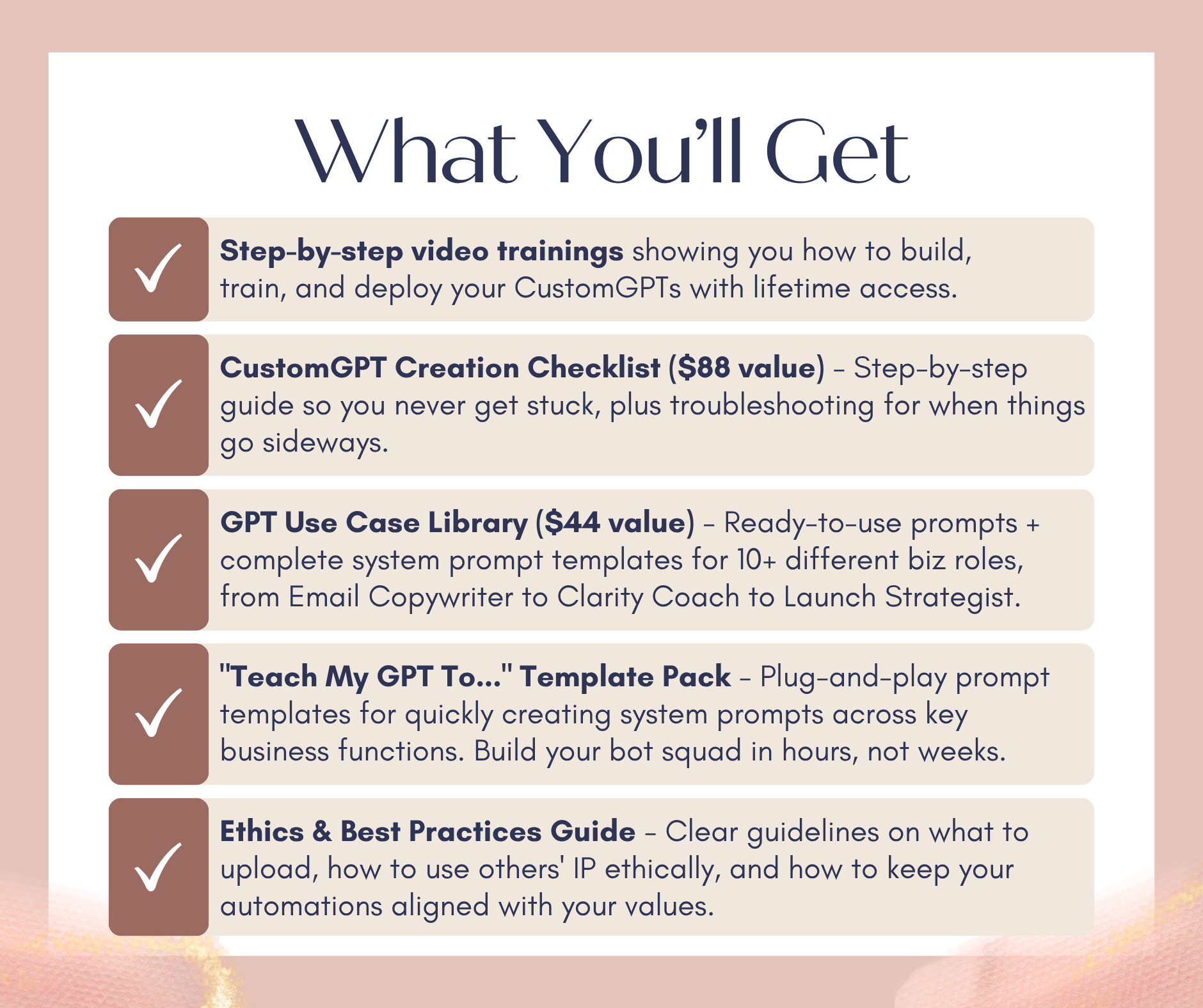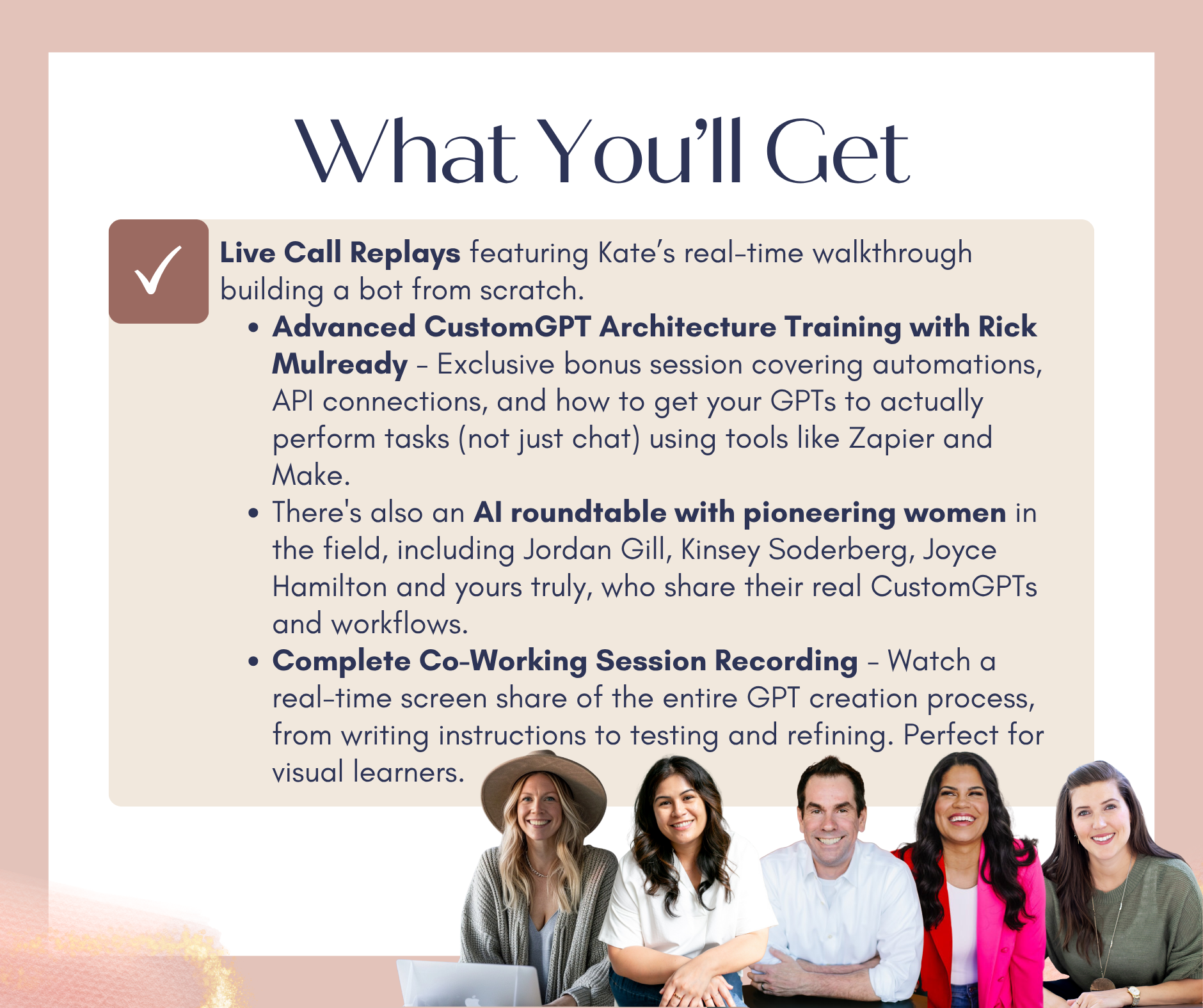- Advanced CustomGPT Architecture Training with Rick Mulready - Exclusive bonus session covering automations, API connections, and how to get your GPTs to actually perform tasks (not just chat) using tools like Zapier and Make.