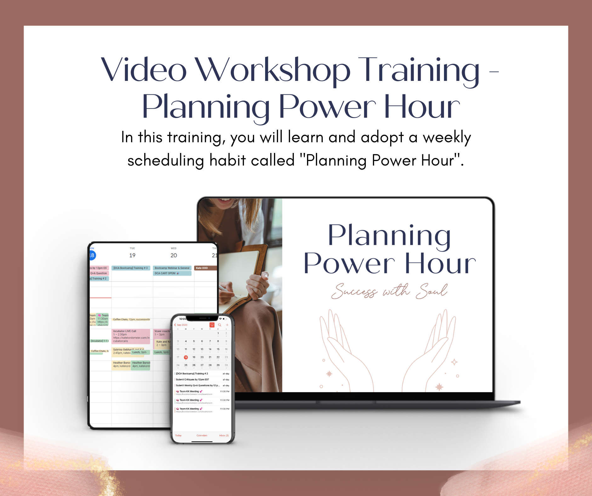 Video Workshop Training - Planning Power Hour: In this training, you will learn and adopt a weekly calendaring habit called "Planning Power Hour". This routine ensures you always prioritize the most important tasks in your schedule, allowing you to confidently let go of lesser tasks without feeling guilty using our proprietary Success with Soul Matrix (it's like the Eisenhower Matrix's cooler, more feminine cousin).