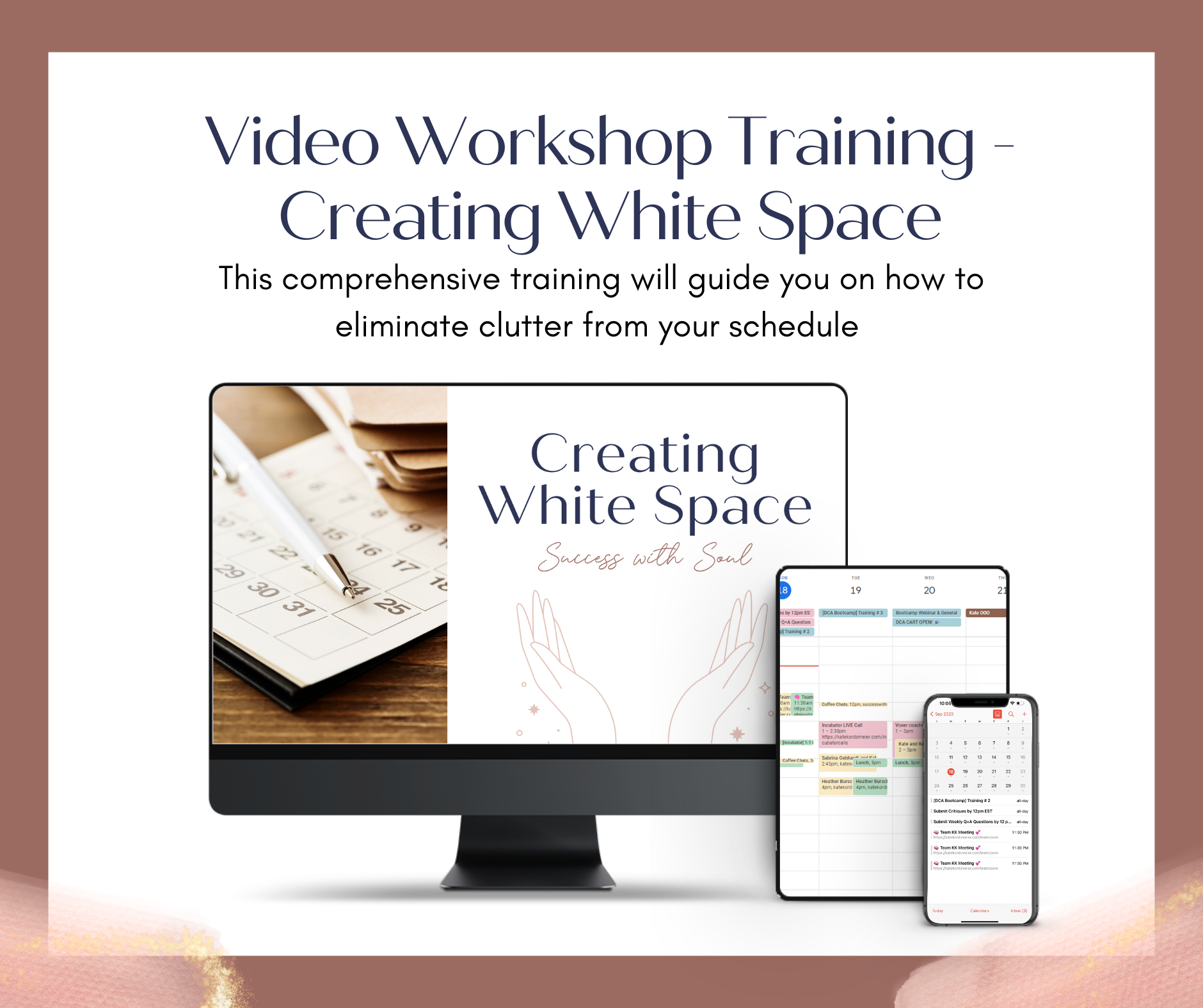 Video Workshop Training - Creating White Space: This comprehensive training will guide you on how to eliminate clutter from your schedule, helping you focus on what truly matters. It empowers you to create the 'white space' needed for self-care, relaxation and creative thinking BEFORE you do anything else.