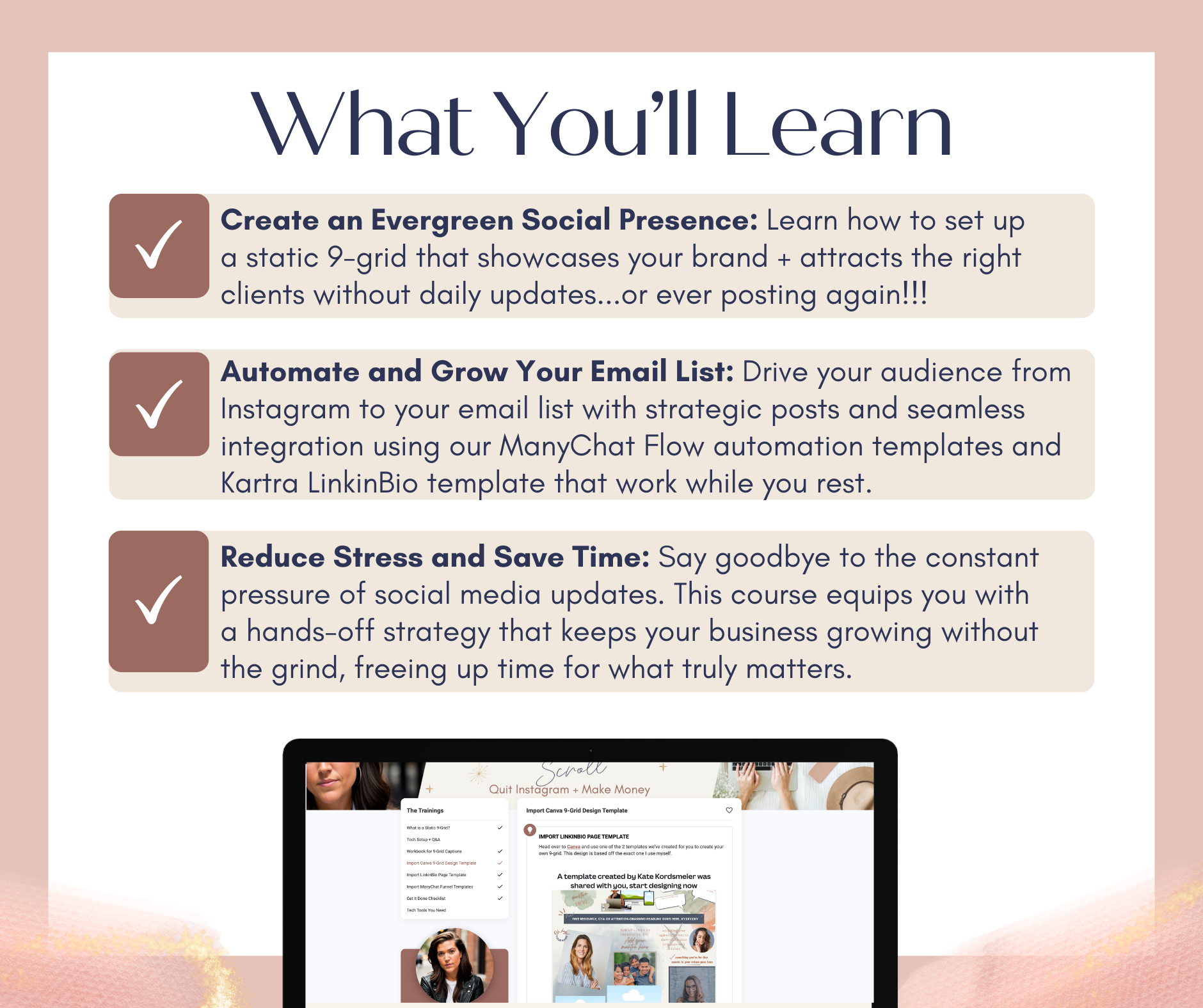 Not at all. We provide step-by-step instructions and support for all tech levels. Plus, if you use Canva, you can import our 9-Grid Template directly into your account in the click of a button. Same with Manychat, which is 100% optional. And we're also providing you a Kartra page template for your linkinbio.