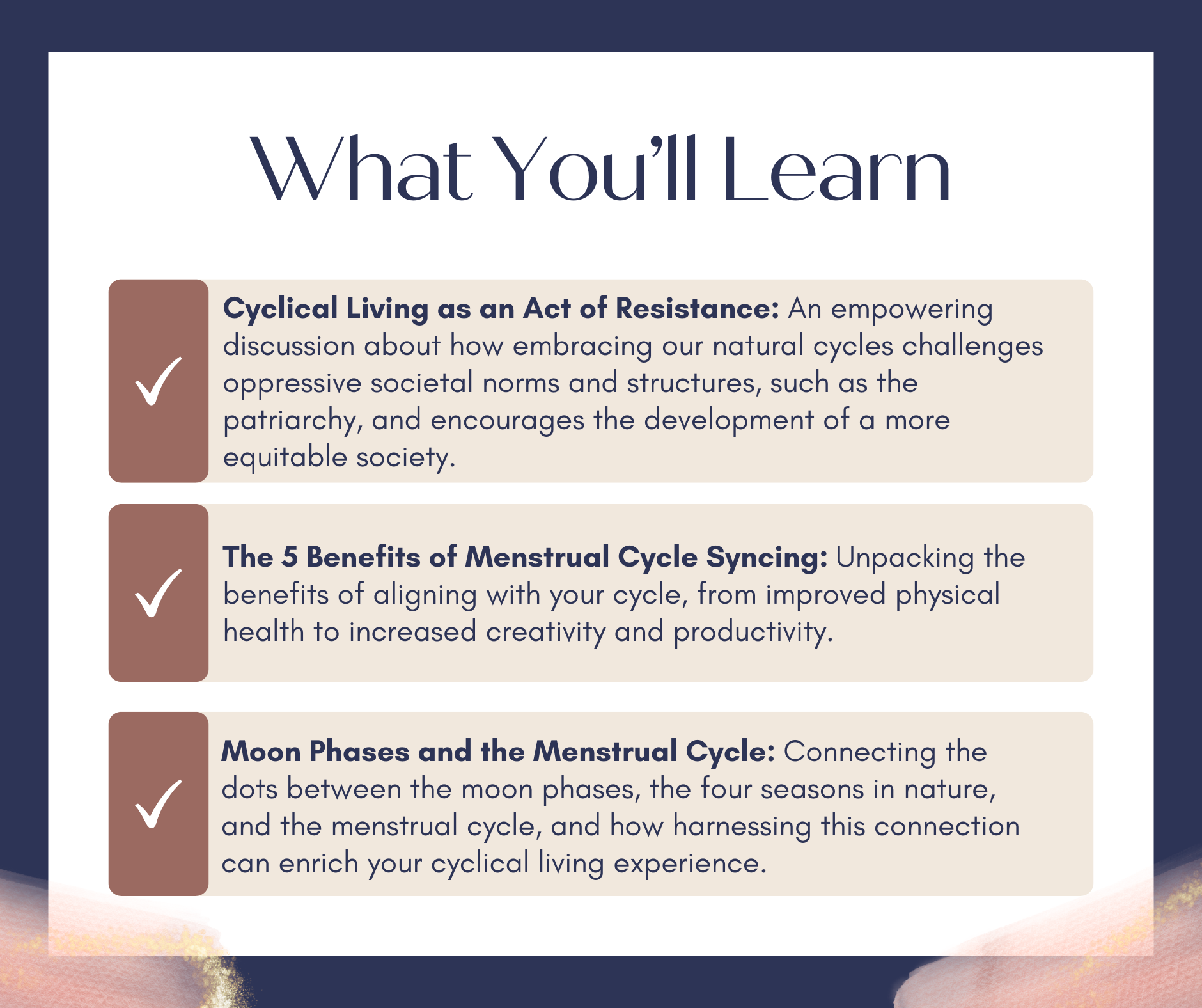 ...and discover how syncing with your body's natural rhythms can lead to a life of more harmony, productivity, and fulfillment. This workshop is a transformative journey designed to equip you with the knowledge and tools to fully embody your feminine energy and align with your natural cycle.