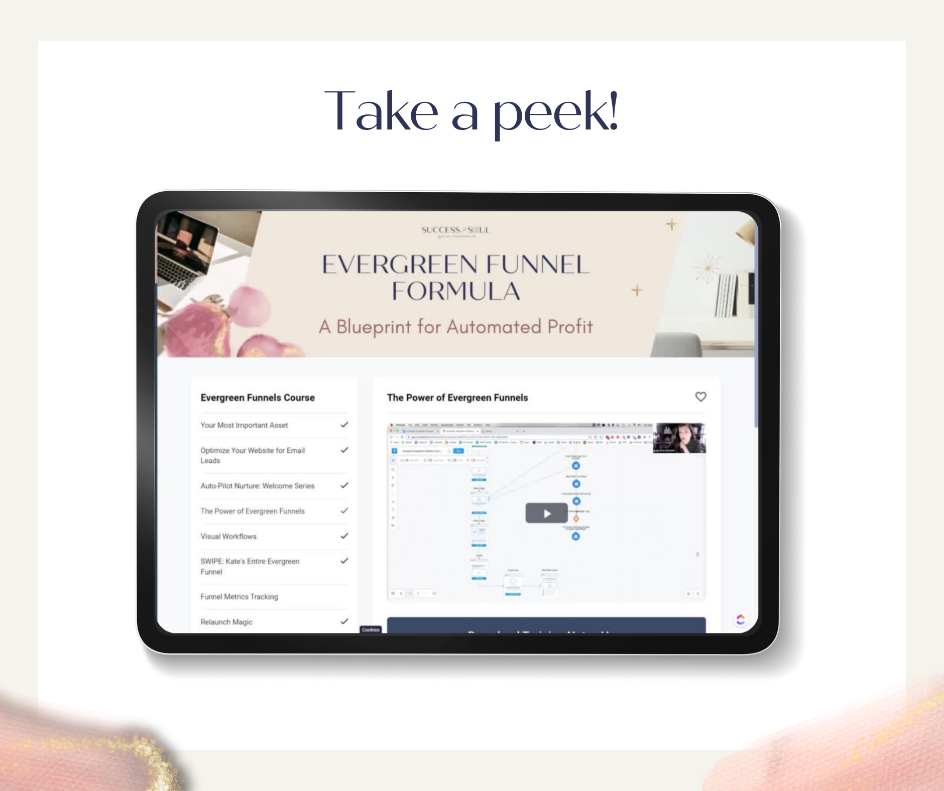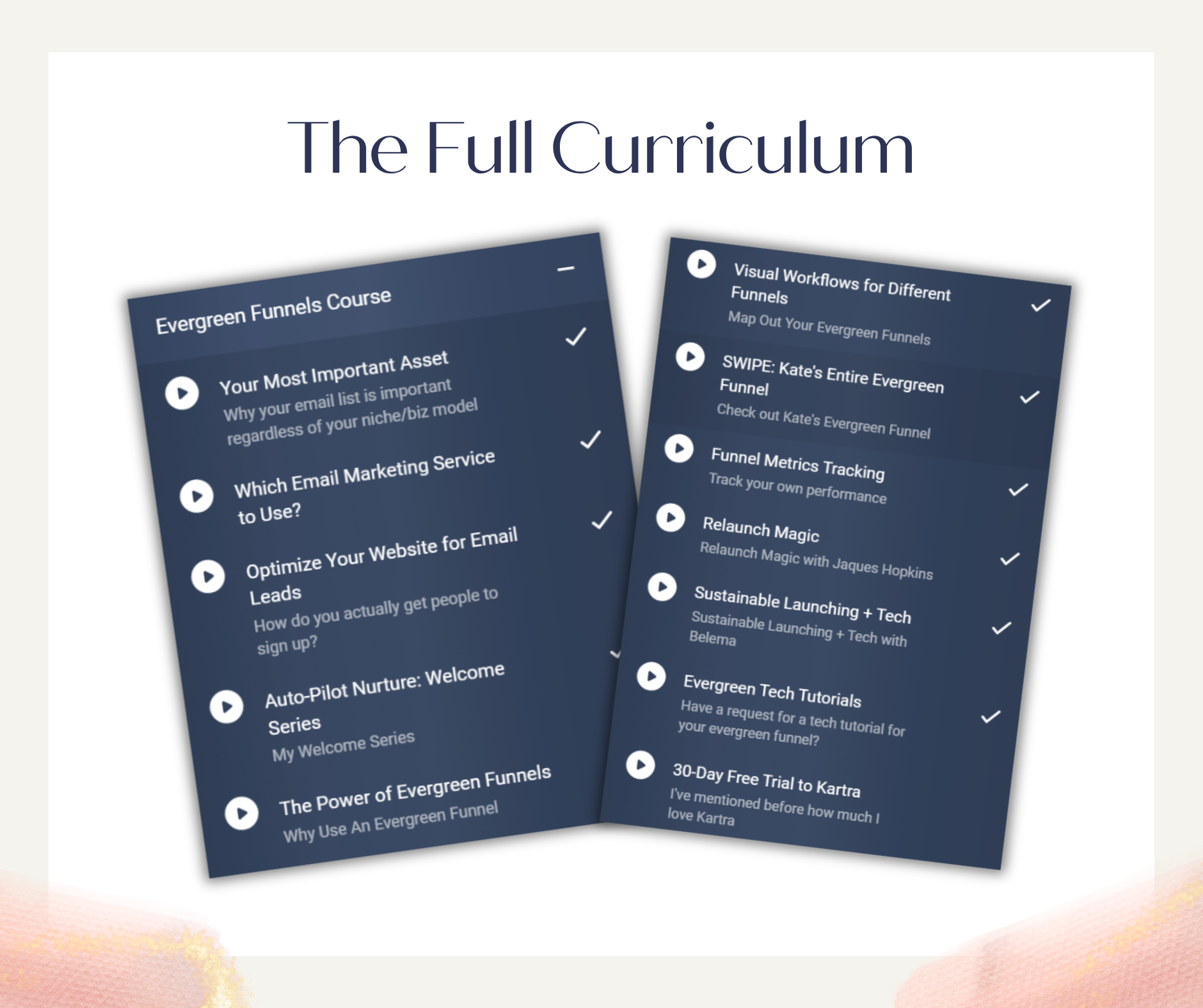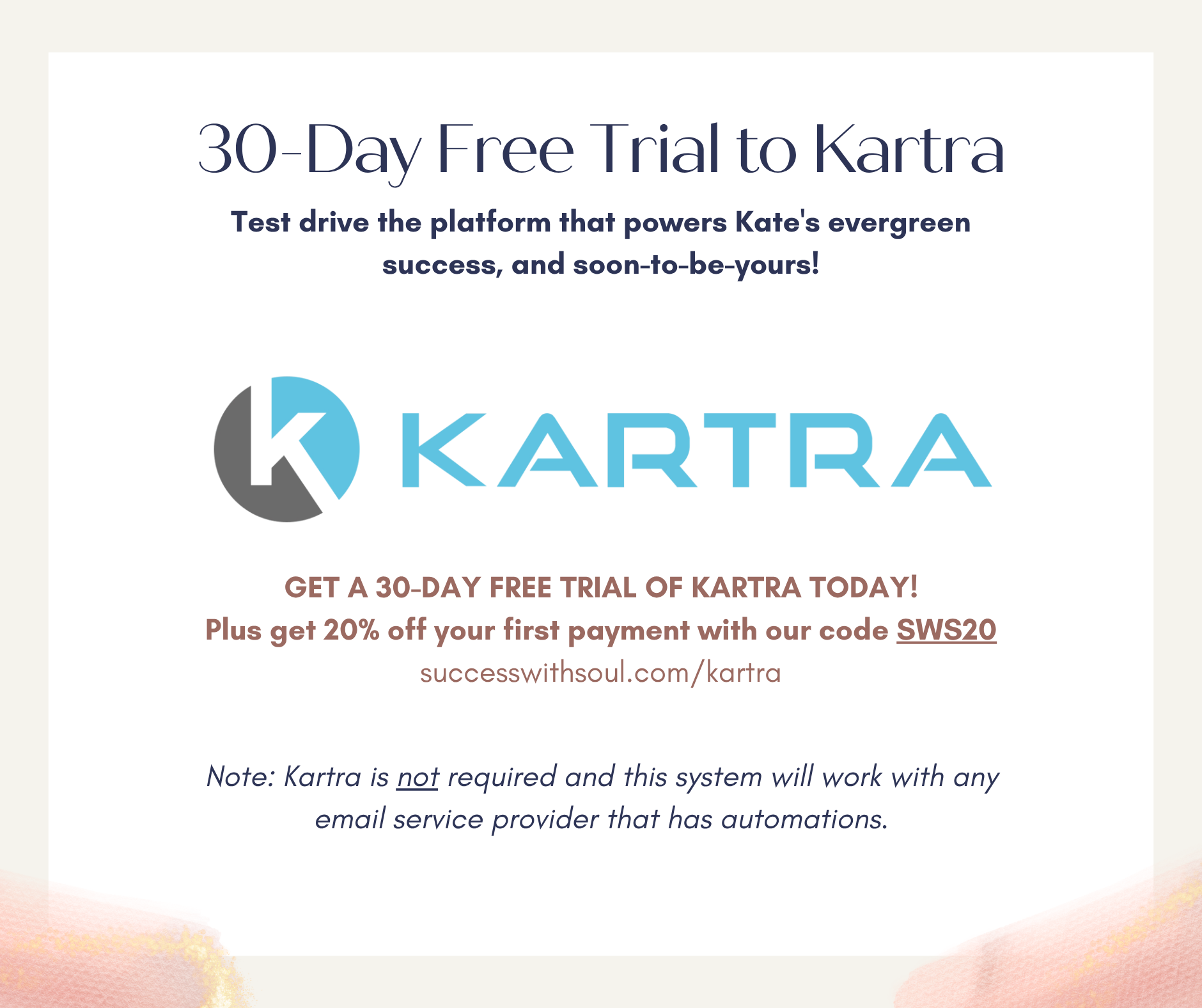 - 30-Day Free Trial to Kartra: Test drive the platform that powers Kate's evergreen success, and soon-to-be-yours! Note: Kartra is not required and this system will work with any email service provider that has automations.