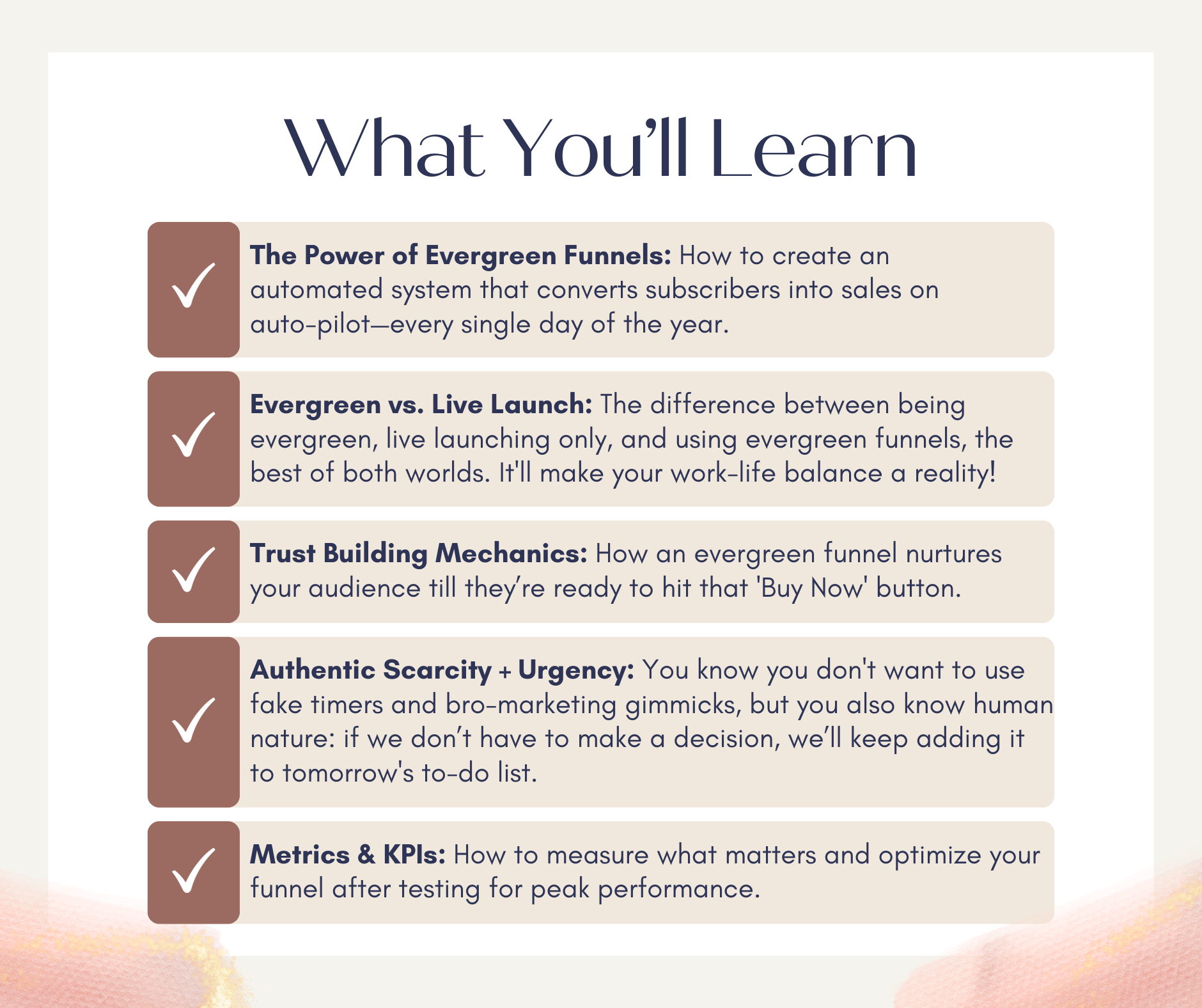 - Evergreen vs. Live Launch: The difference between being evergreen, live launching only, and using evergreen funnels, the best of both worlds. It'll make your work-life balance a reality!