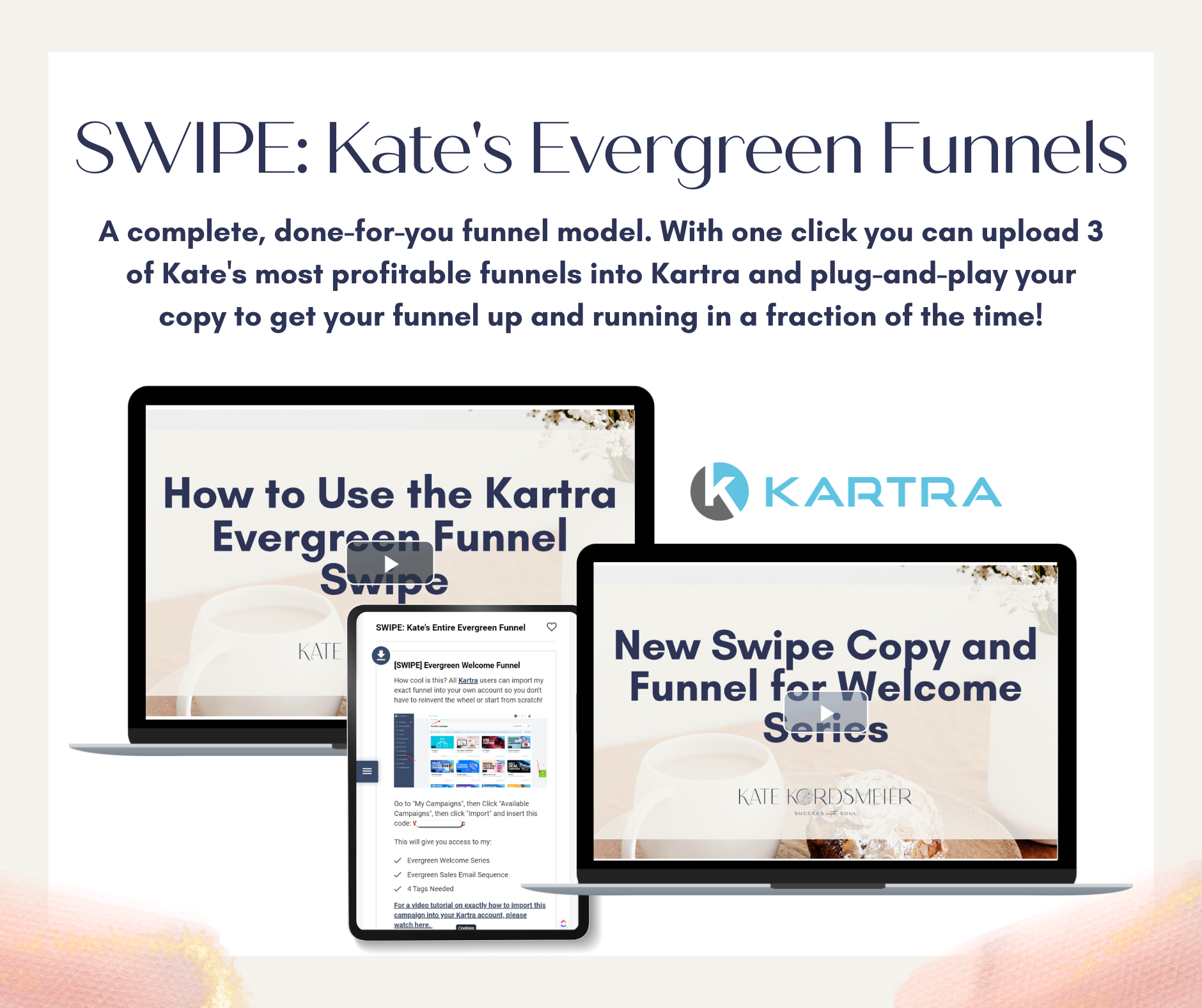 - SWIPE: Kate's Evergreen Funnels: A complete, done-for-you funnel model. With one click you can upload 3 of Kate's most profitable funnels into Kartra and plug-and-play your copy to get your funnel up and running in a fraction of the time! These are the same funnels that have earned me over $50k/mon!
