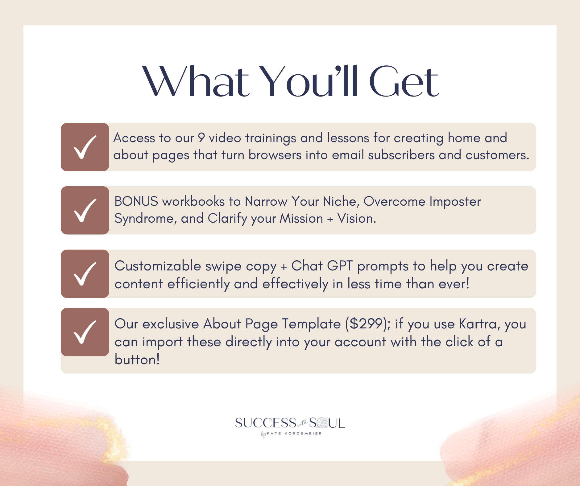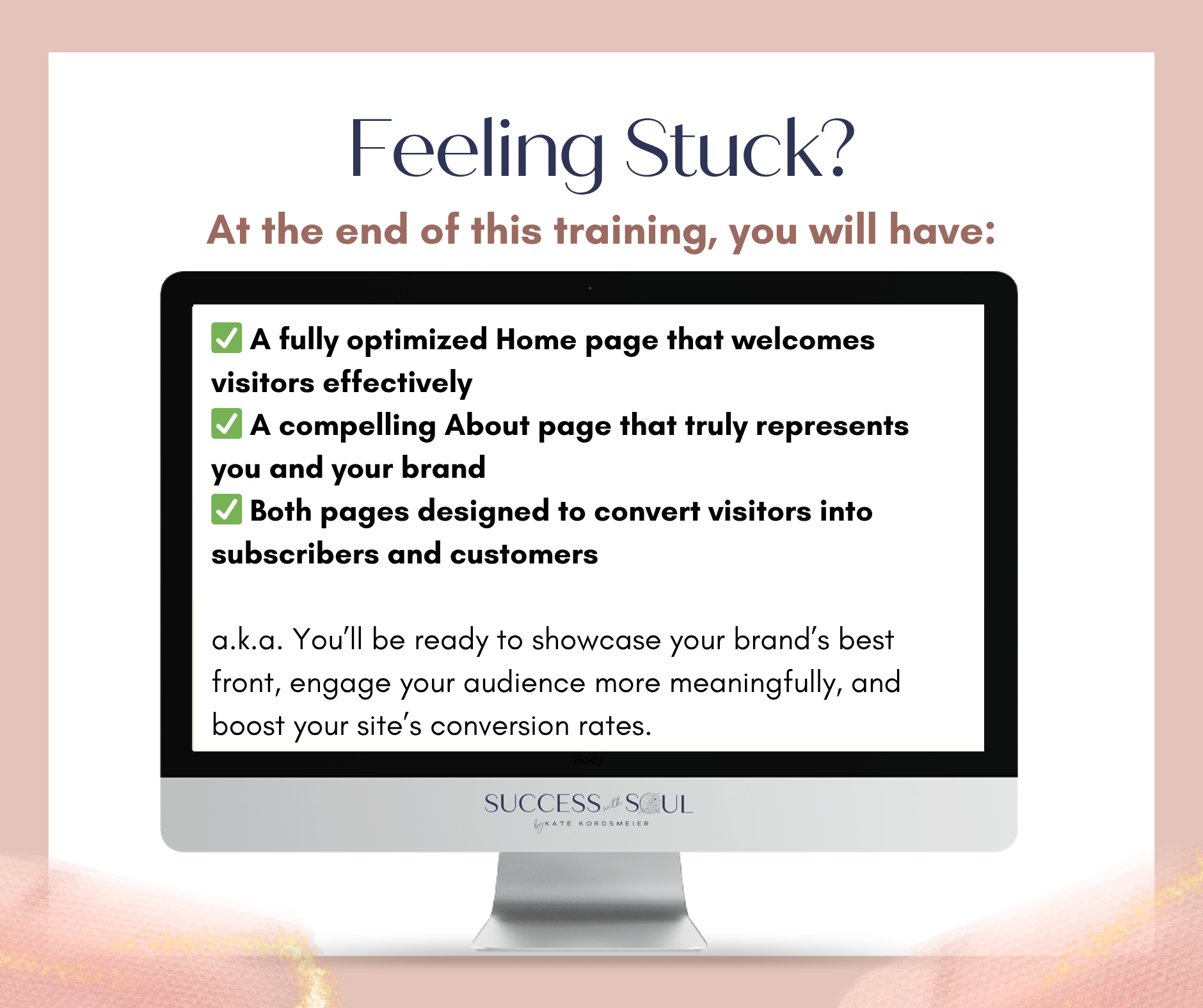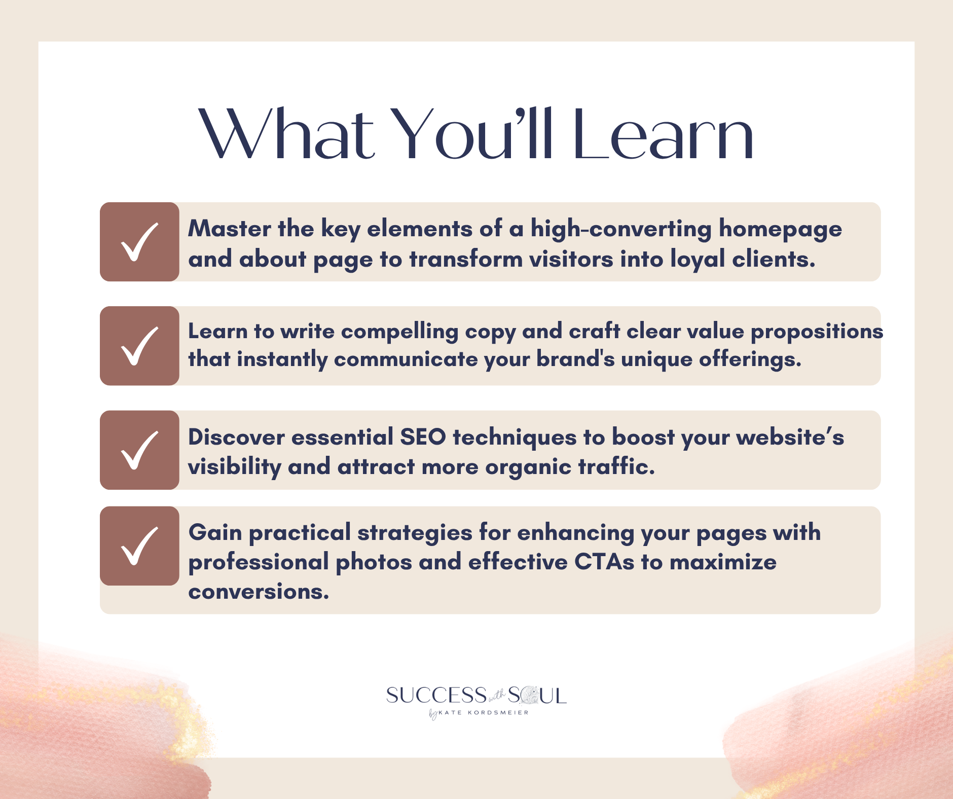 You will leave this training with a clear roadmap and the tools they need to create high-converting homepage and about pages that authentically represent your brand and attract your dream clients.