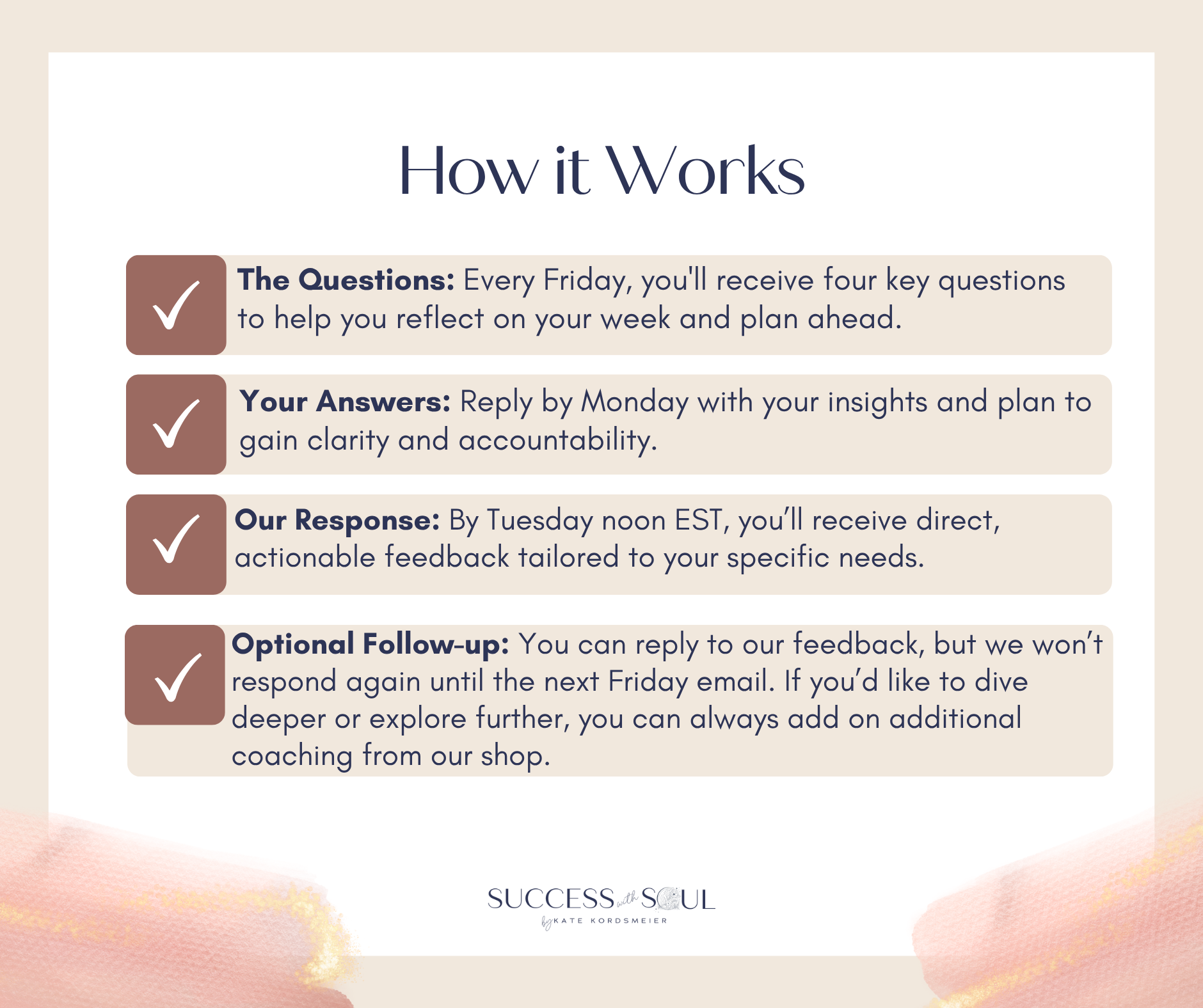 - Optional follow-up: You can reply to our feedback if it helps you process, but itâs not required, and we wonât respond again until the next Friday email. This structured format ensures you get the most out of each exchange without overwhelming you or cluttering up your inbox.Â