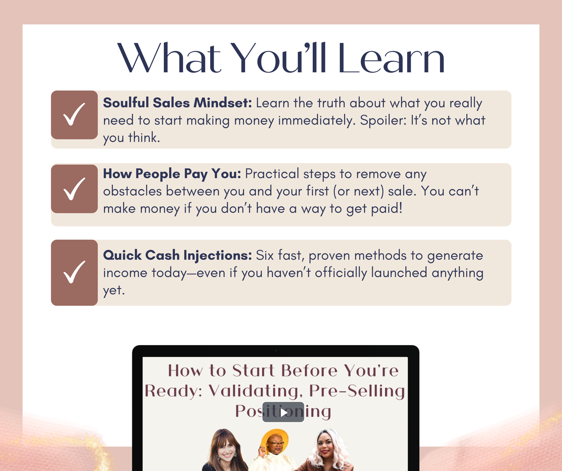 - Soulful Sales Mindset: Learn the truth about what you really need to start making money immediately. Spoiler: It’s not what you think.