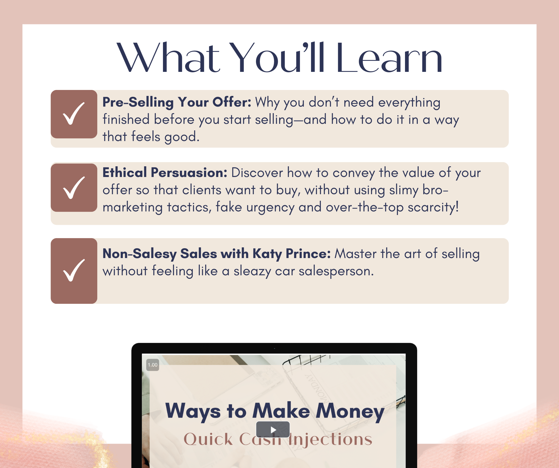 - 6 Video Lessons to dive deep into transforming your mindset, creating quick cash injections, mastering pre-selling, and using ethical persuasion to land clients—even without a website or audience—all while staying true to your values and avoiding any gross salesy tactics.