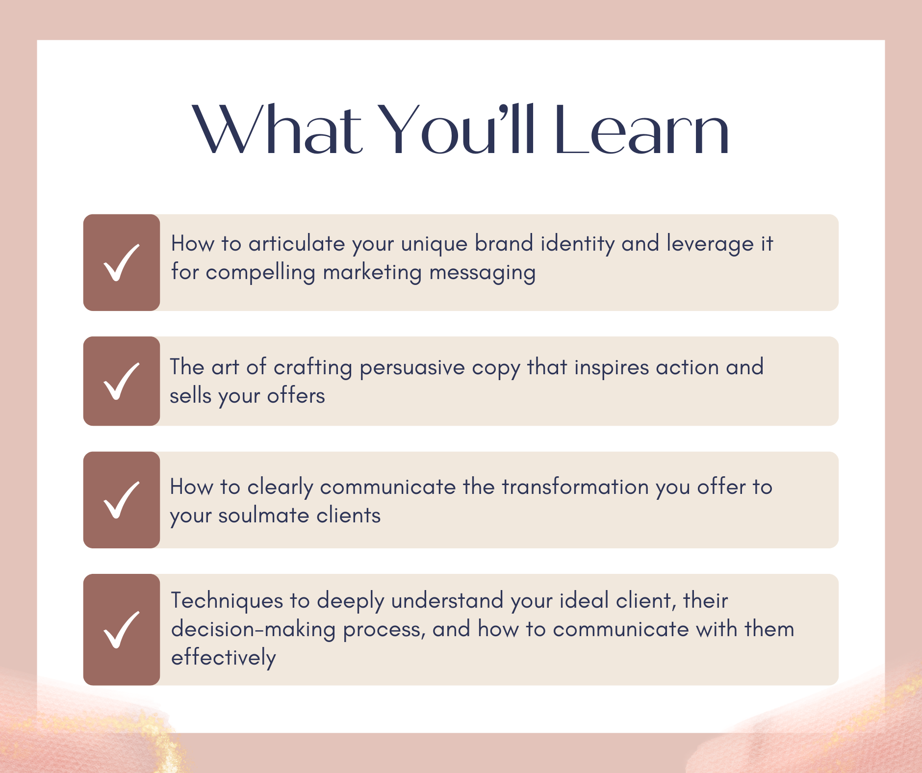 What if I am afraid of narrowing down my niche? The workshop will guide you on how to identify your soulmate clients without feeling like you're excluding potential customers. Remember, when you speak to everyone, you speak to no one.