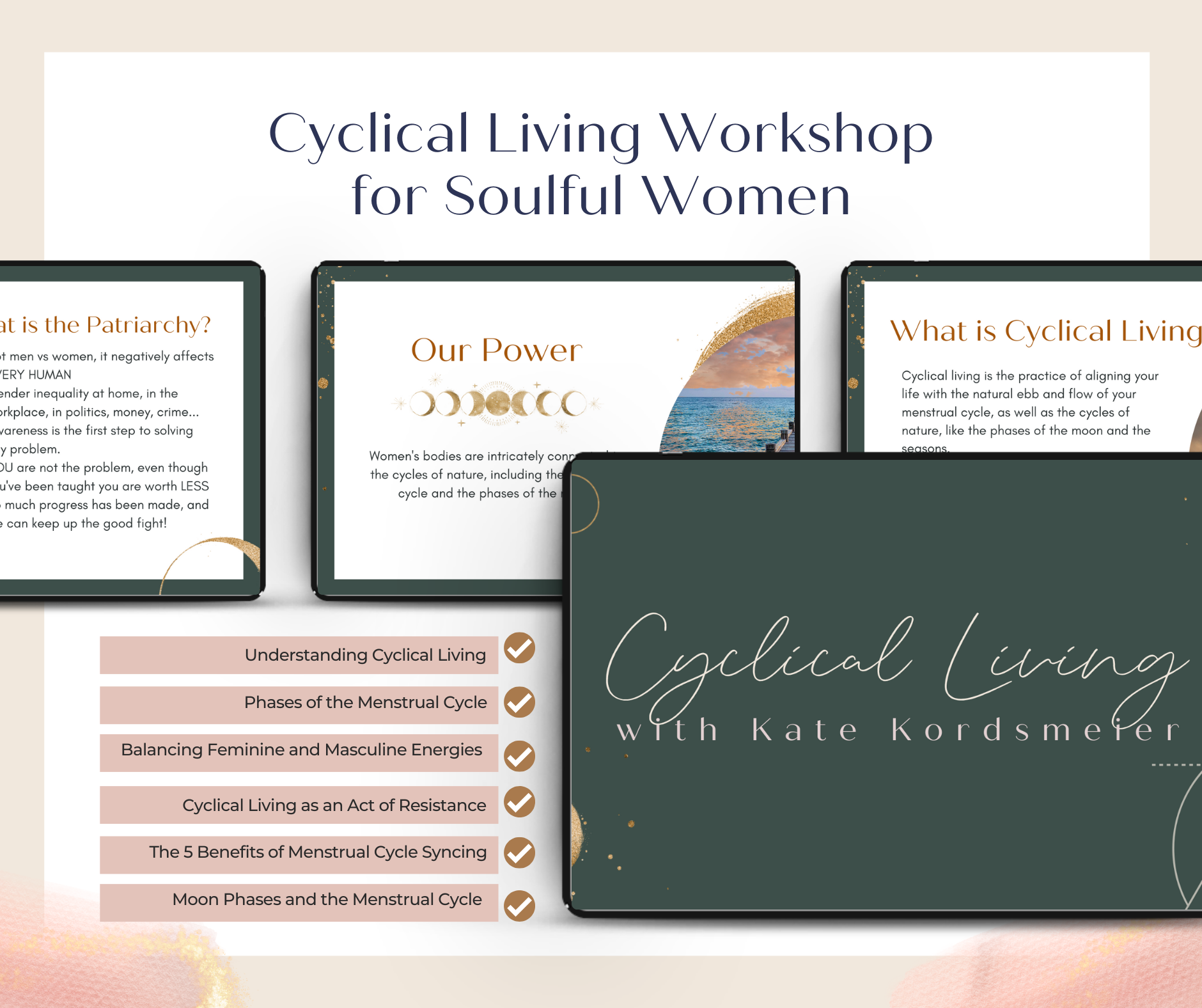 - Cyclical Living for Soulful Women ($22 value): Learn how to sync your schedule with your menstrual cycle and/or the moon for improved physical, emotional, and mental well-being, increased productivity, and more grace and self-compassion.