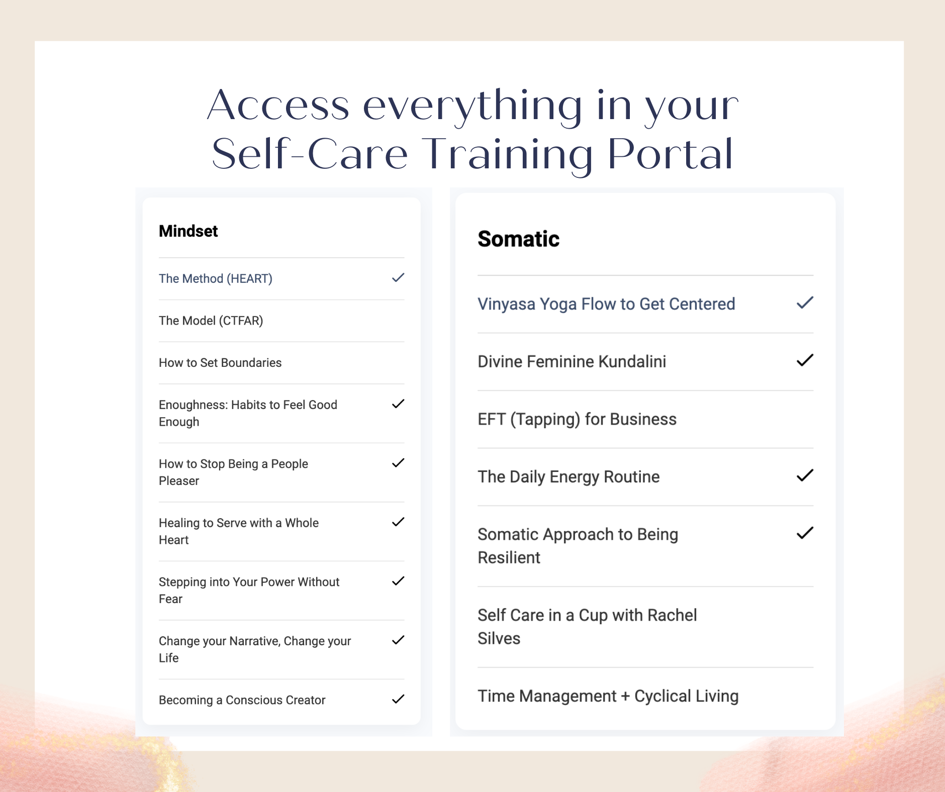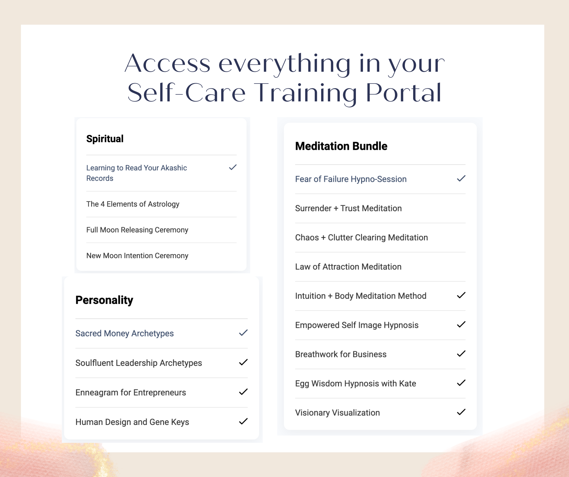 - Plus, 4 self-care modules (Mindset, Somatic, Spirituality, and Personality), full of video and audio trainings, meditations, hypnosis audios, EFT tapping, yoga classes, breathwork, Divine Feminine Kundalini, Akashic Records, astrology, moon rituals, Sacred Money Archetypes, Enneagram for Entrepreneurs, and insights into Human Design.