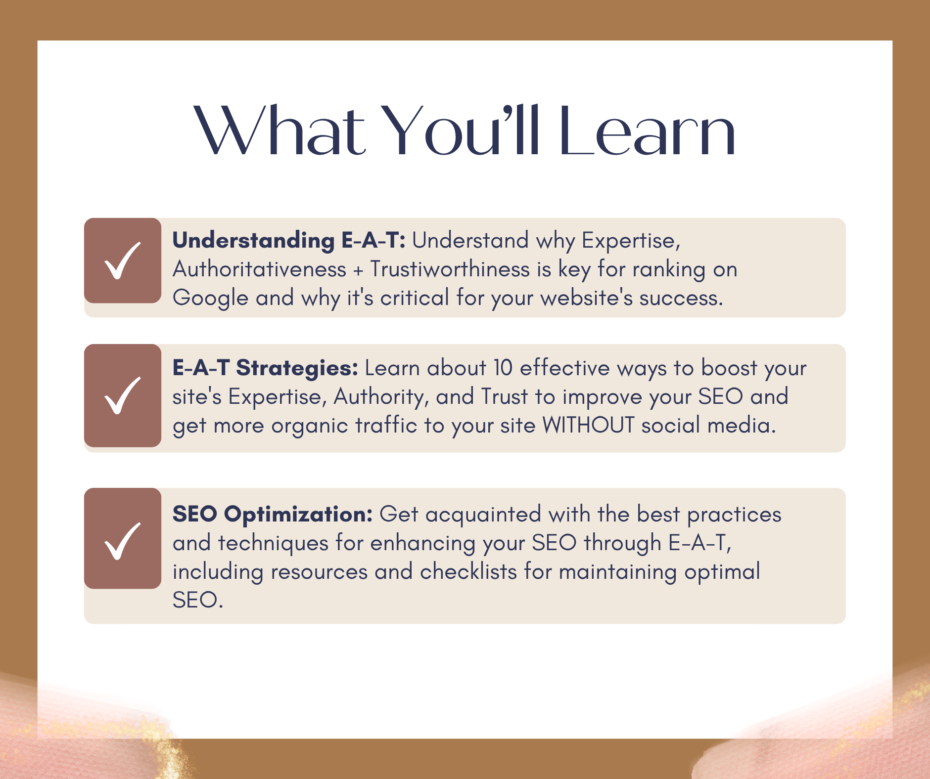 How can I apply the E-A-T strategies to my website? During the workshop, we'll be providing actionable strategies and checklists to help you implement what you've learned on your website.