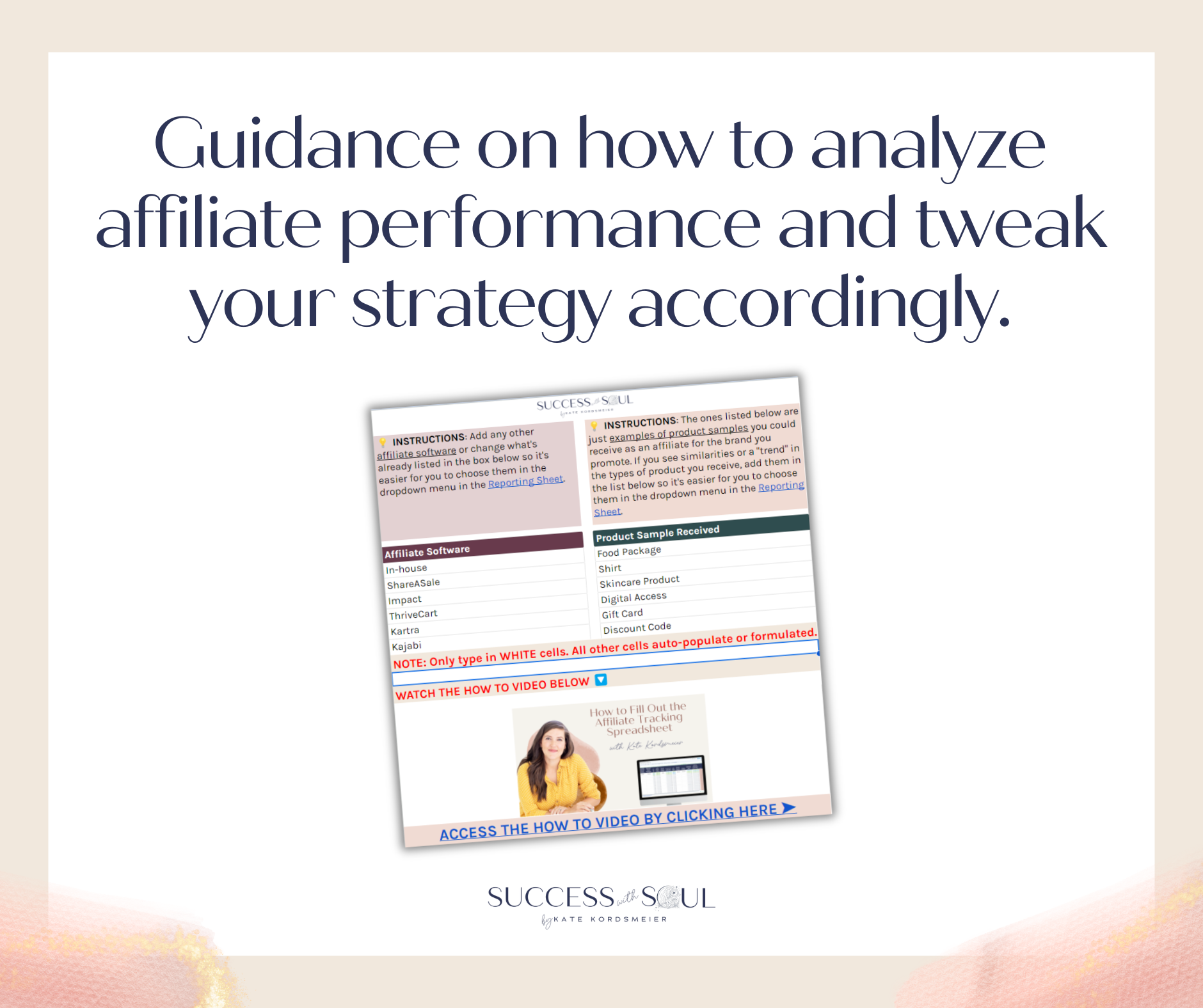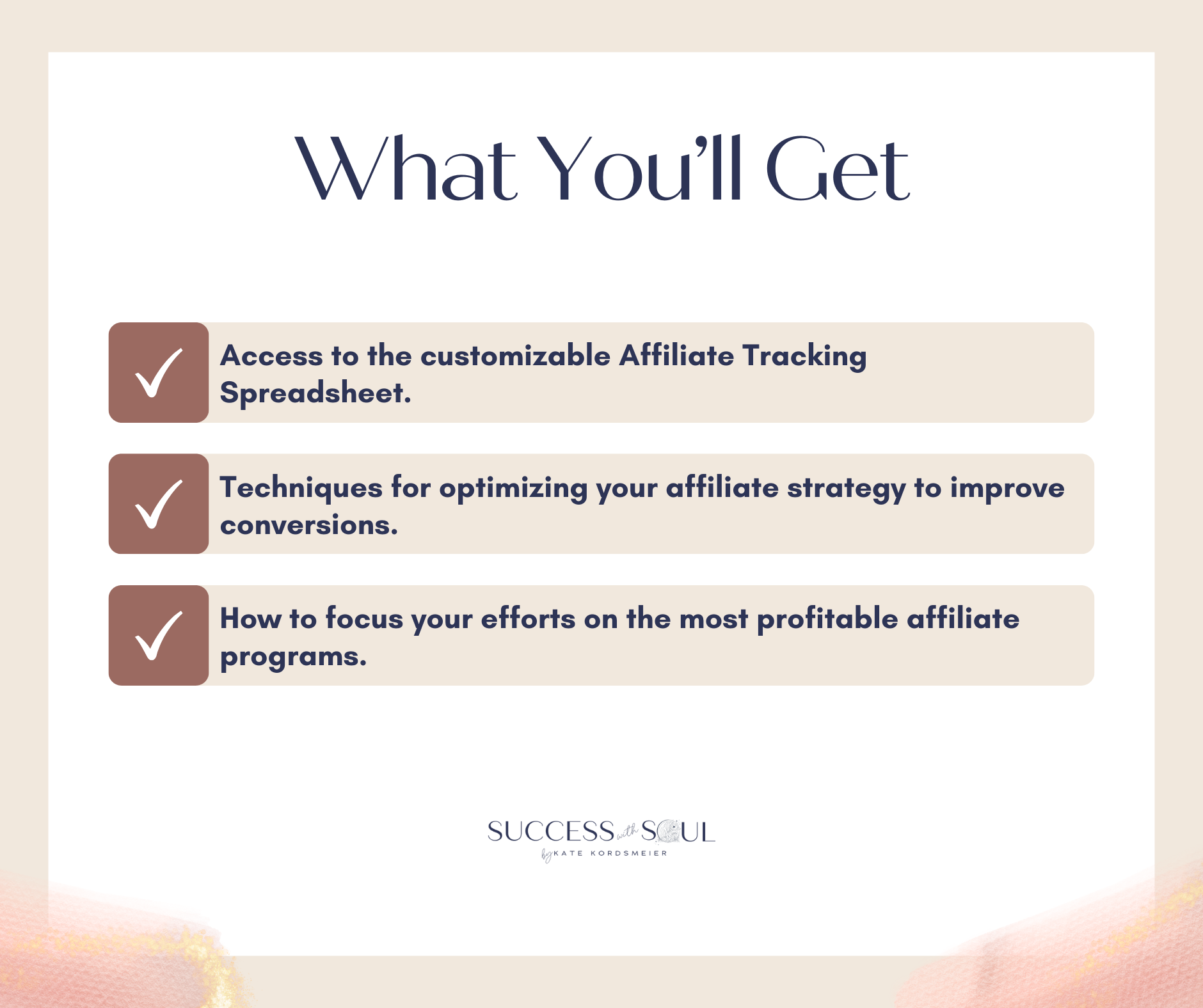 - Access to the customizable Affiliate Tracking Spreadsheet.