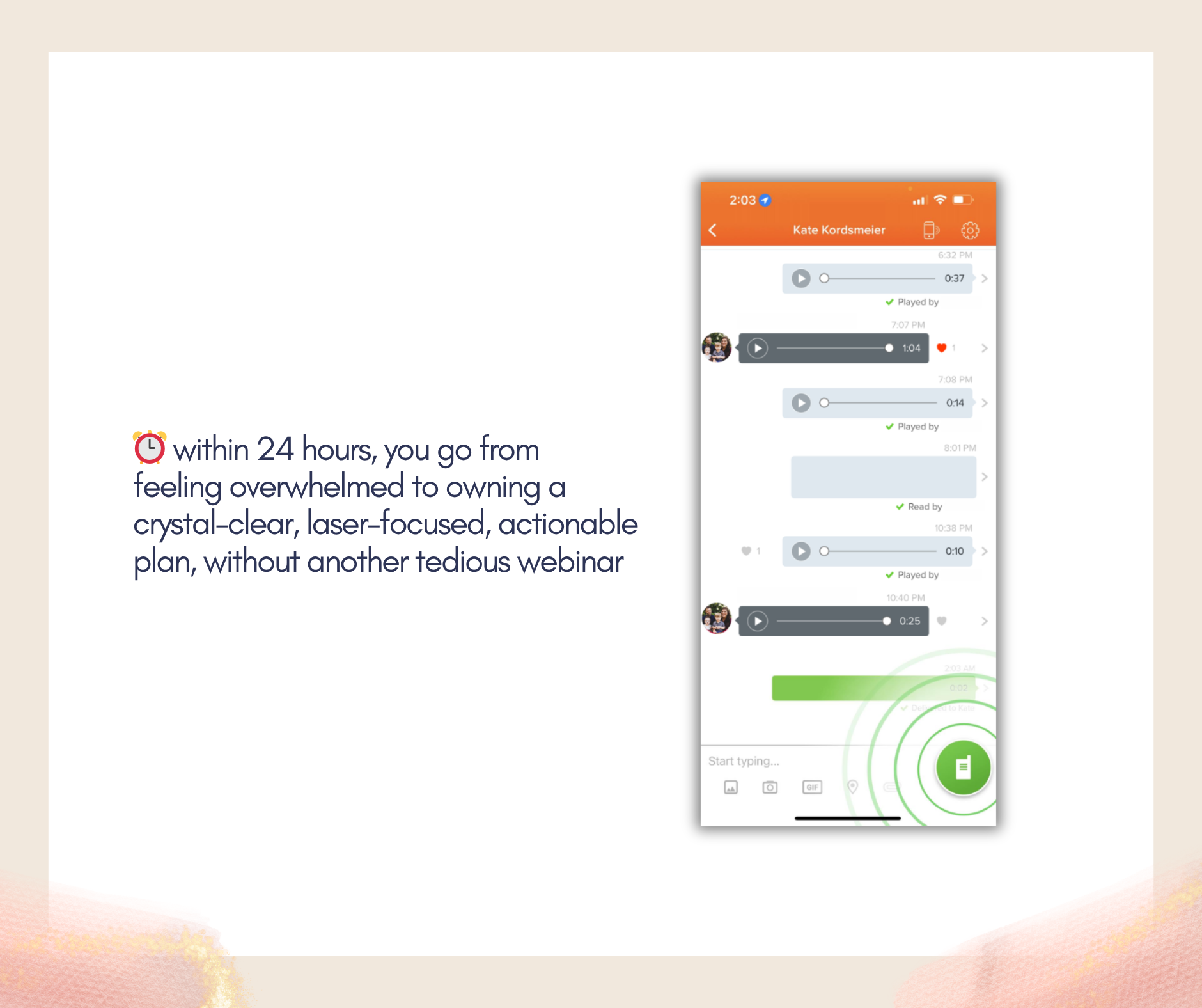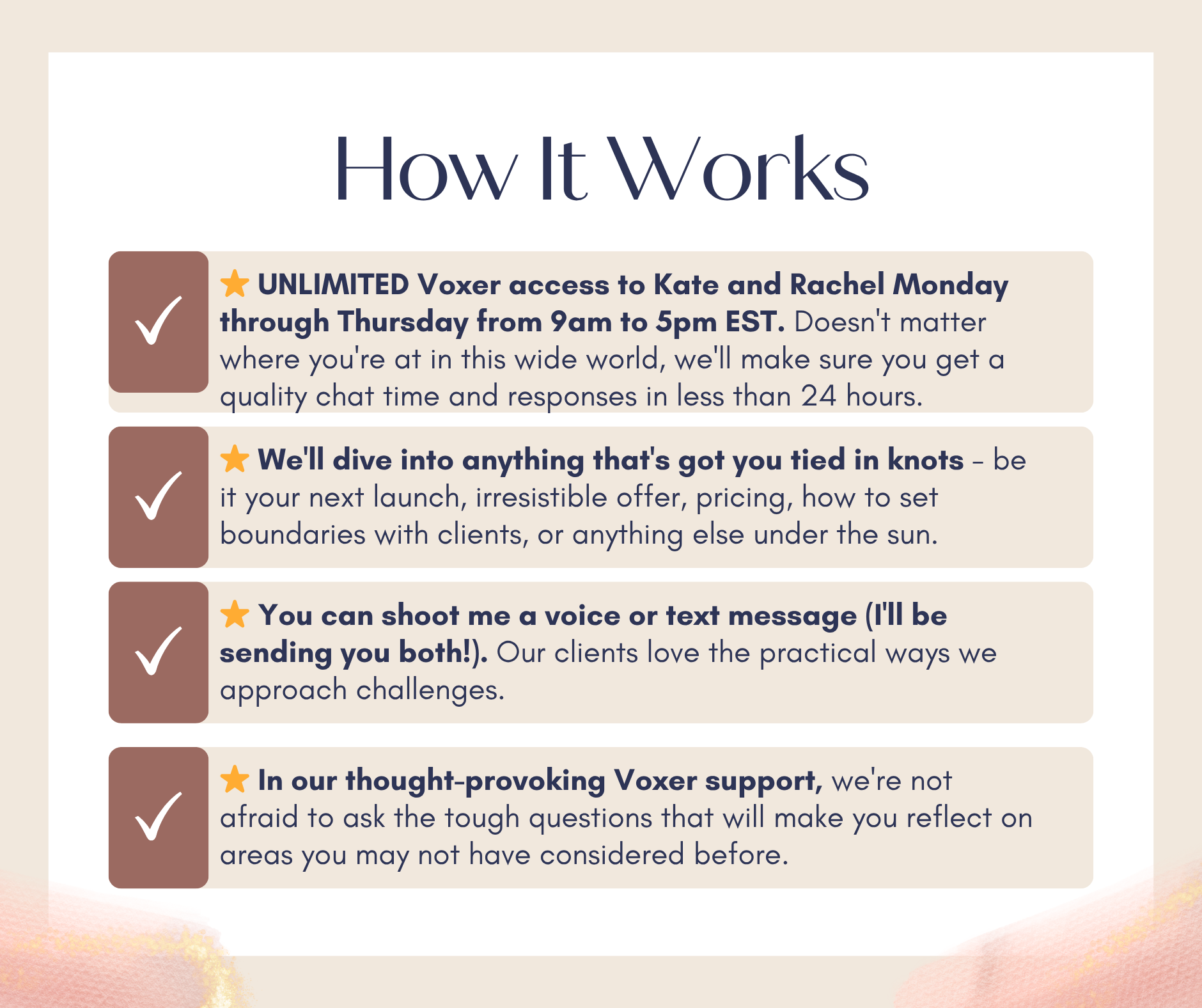 ⭐ You'll get UNLIMITED Voxer access to Kate and Rachel Monday through Thursday from 9am to 5pm EST. Doesn't matter where you're at in this wide world, we'll make sure you get quality chat time within 24 hours. It’s like having unlimited free refills of clarity and focus, all day long, without the hassle of setting up lengthy calls or meetings or waiting around for email responses. You get answers when you need them, helping you move forward faster.